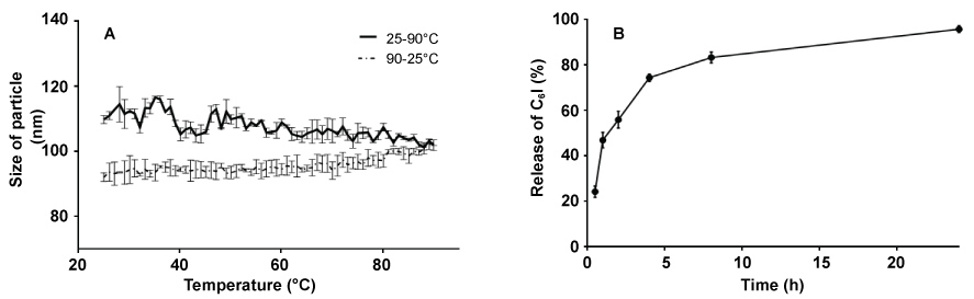 stored at 2-8 ℃, and the mean particle diameter, PI, zeta potential and DL were determined after 30 and 60 days of storage. The average of particle size was analyzed as previously described. The stability evaluation in terms of EE and DL was determined after separation of unbound C6I by size exclusion chromatography, as described above. The effect of autoclaving was also evaluated, for this assessment, the PC6I formulation was divided into two aliquots of equal volume. One aliquot was autoclaved at 121 ℃ for 20 min, while the other aliquot was maintained at 2-8 ℃ as a reference sample and then, the physicochemical properties (particle diameter, PI, surface charge, DL and EE) were compared. Additionally, the influence of temperature on the physical stability of PC6I was evaluated using DLS (Zetasizer Nano S). Samples were diluted with purified water (1:100) in a quartz cell, and particle size analysis was performed while heating the sample from 25 ℃ to 90 ℃ at a rate of 0.5 ℃/min and then cooling it from 90 ℃ to 25 ℃ at the same rate. Particle size was measured every 0.5 ℃. This assay was done in triplicated.