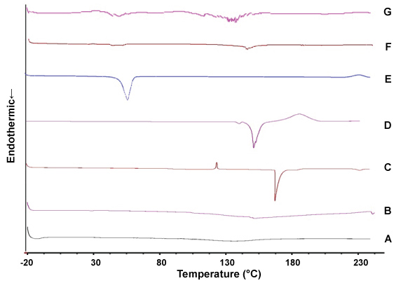 Figure 4: Thermograms of the components of Precirol® nanoparticles. (A) Tween 20, (B) lecithin, (C) sodium deoxycholate, (D) free C6I, (E) Precirol®, (F) empty Precirol® nanoparticles, (G) Precirol® NP with C6I. View Figure 4
