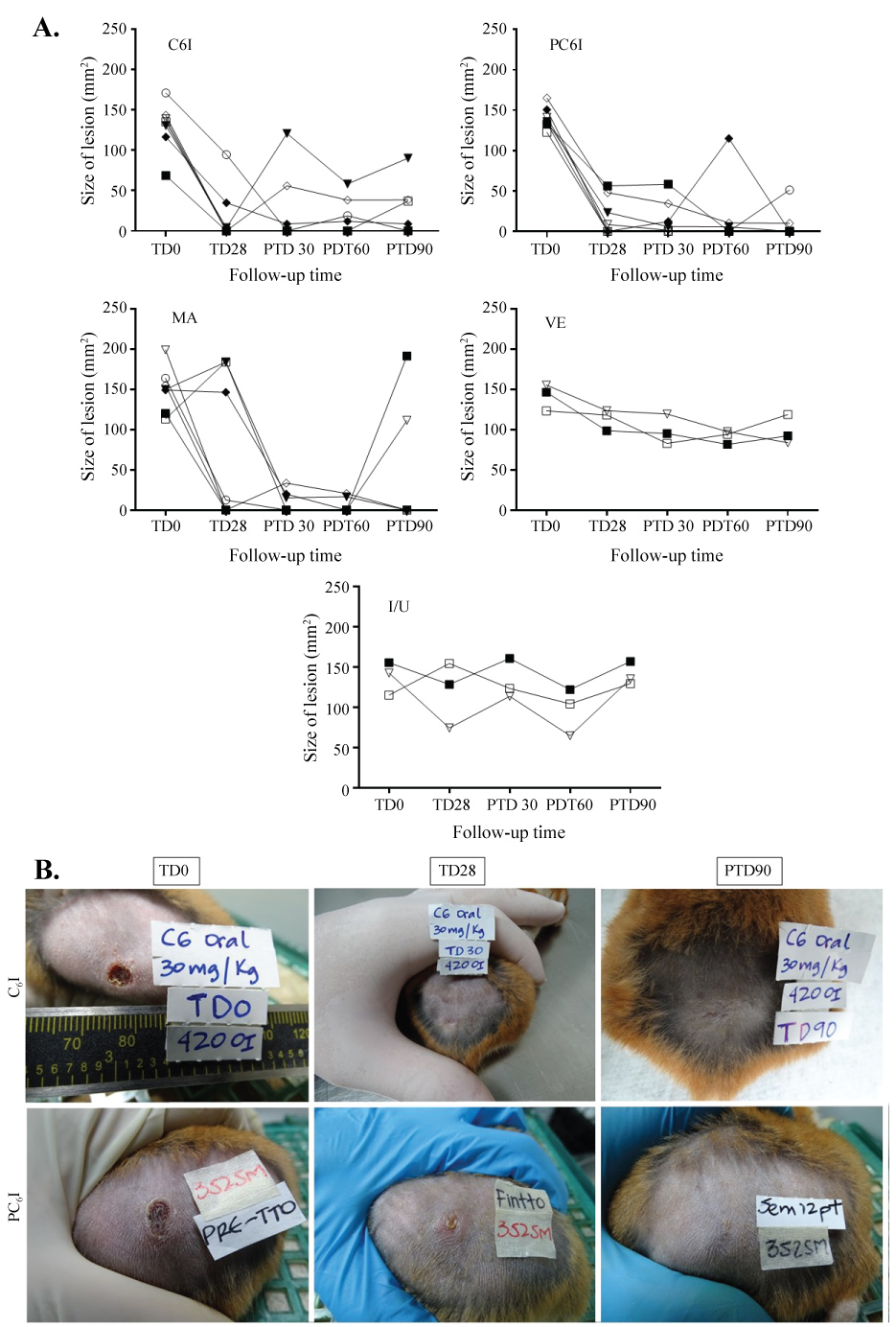 Figure 5: Response of hamsters after treatment with free quaternary halomethylated ammonium iodide and incorporated in Precirol® nanoparticules vs. meglumine antimoniate. (A) The graphs show the outcomes of hamsters after treatment with oral free C6I, Precirol® NP with C6I (PC6I), intramuscular meglumine antimoniate (MA) or vehicle (VE) in comparison with infected and untreated hamsters. Evaluations were done at the end of treatment and post-treatment days 30 (PTD30), 60 (PTD60) and 90 (PTD90). Data represent the size of lesions at each time of follow-up. (B) Treatment progress of cutaneous leishmaniasis caused by L. (V) braziliensis in one hamster treated with C6I and one treated with PC6I (a) Before treatment (TD0); (b) On day 28 at the end of treatment (TD28) and (c) on day 90 post treatment (PTD90). View Figure 5