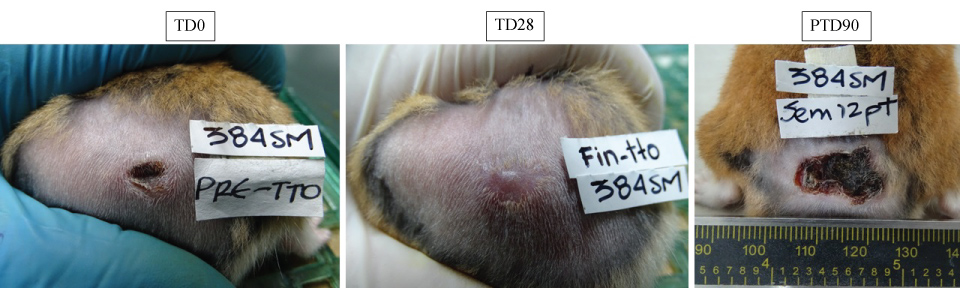 Figure 6: in vivo effect of free quaternary halomethylated ammonium iodide and incorporated in Precirol® nanoparticules. The figure shows representative images of a skin injury caused after injection of 5 × 107 by Leishmania (V) braziliensis in one hamsters and their evolution after treatment with PC6I at 30 mg/kg/day during 28 days. (a) appearance of lesion before treatment (TD0); (b) appearance of lesion at the end of treatment (TD28) and (c) appearance of skin 90 days after treatment ended (PTD90). Notice the decrease in size after treatment and the development of scar tissue after cure. View Figure 6