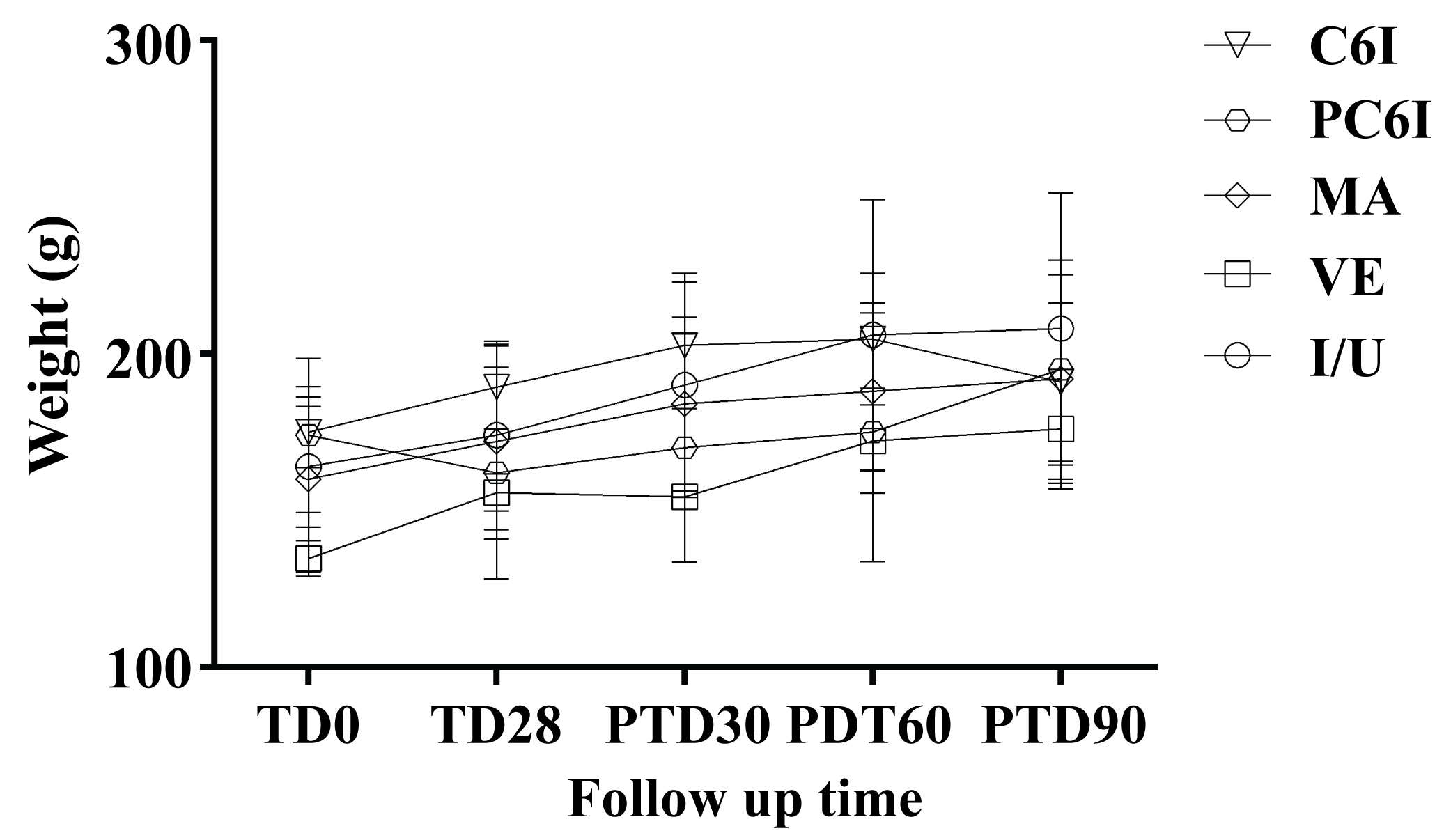 Figure 7: Effect of treatment in the weight of hamsters. The figure shows the evolution of the weight of hamsters in each group of treatment. Data represents the mean value ± SD of the weight in grams of hamsters in each experimental group: oral free C6I; Oral Precirol® NP with C6I (PC6I); Intramuscular meglumine antimoniate (MA), Vehicle (VE) or Untreated (I/U). View Figure 7