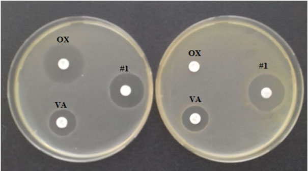Figure 2: Antibiotic sensitivity of two S. aureus strains: FDA 209P (MSSA, left) and INA 00761 (MRSA, right). On the left side of the cups there are disks with 1 mcg of oxacillin (OX, above) and 5 mcg of vancomycin (VA, below). On the right sides is a disc with 5 mcl of the component #1 from CL of the strain 534.