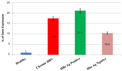 Out of 60 samples of case group were 43(71.6%) Males and 17(28.4%) females and in control group were 56(93.3%) Males and 4(6.7%) females. In Table 2, the relationship between SNPrs10204525 and the gender of people in different groups has been investigated. Regarding the results, there was no significant relation between sex and SNP rs 10204525. Polymorphism of the rs10204525 has a significant difference in hepatitis B and healthy subjects (P.Value < 0.001). So percent and prevalence of GG allele is equal in healthy and chronic hepatitis B patient groups, but frequency of AA allele in healthy people and GA allele in chronic hepatitis B patient group were more than other groups. In other words, there is a significant relation between the GA allele and the hepatitis B infection (Table 3). The relative mRNA expression of PD-1 in patients with chronic hepatitis B, HBeAg positive, HBe Ag negative and healthy group was shown in Figure 1. The expression level of mRNA PD-1 in HBeAg positive patients is higher than HBe Ag negative and in patients with chronic hepatitis B, is more than, HBe Ag negative group. All of 120 samples in this study (case, control), 8 samples had HBeAg positive and 112 samples were HBe Ag negative. There was no significant relation between HBe Ag and SNP alleles of PD-1, (P > 0.33) (Figure 2). SNP alleles of rs10204525 have been evaluated in chronic hepatitis B with HBV DNA load. According to the results, there is a significant relationship between rs10204525 polymorphism with HBe Ag (P < 0.05). So that in HBe Ag positive patients, the GG allele was more than other alleles and the AA allele were least of alleles. Regarding the results, the female or male status of the subjects in the study groups is not related to SNPrs10204525 (Table 3). The levels of Serum Glutamic-Oxaloacetic Transaminase (SGOT), Serum Glutamate-Pyruvate Transaminase (SGPT) and alkaline phosphatase (Alk) were measured. The results showed that mean of SGOT was 39.20 ± 3.96 IU/ml, Alk value of 107.63 ± 10.01 and SGPT was 40.98 ± 4.91. There was a significant relation between SGOT, SGPT and GG allele but no about Alk (Data not shown). Investigating the relationship between SNPrs10204525 and chronic hepatitis B with HBV DNA in different groups showed a significant relationship between SNPrs10204525 and HBV DNA load in hepatitis B virus (P < 0.05) (Table 4). In patients with chronic hepatitis B, the rate of the GG allele is more than other salleles.