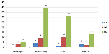 Figure 2: Frequency distribution genotype of rs10202545 in two groups HBe Ag positive and negative and different gender.