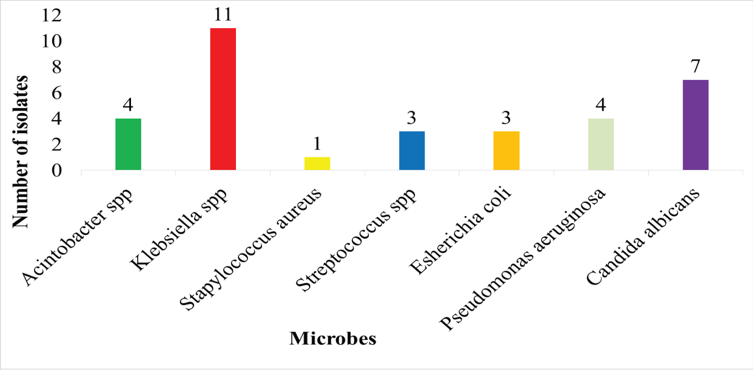 Microbial growth was detected in 65% (33/51) of collected samples. The majority of microbial isolates (78.9%, 26/33) were bacteria; while the other isolates were belonging to Candida spp. (21.2%). Six bacterial genera were detected and the most common was Klebsiella spp . (42.3%, 11/26), followed by Acinetobacter spp (15.4%, 4/26) and Pseudomonas aeruginosa (15.4%, 4/26), and both Streptococcus spp and E. coli were (11.5%, 3/26), and Staphylococcus aureus (3.9%, 1/26) as shown in Figure 1.