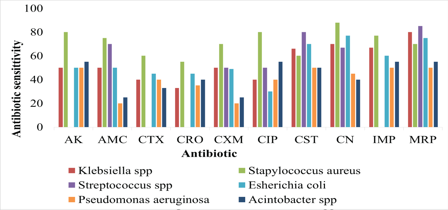 From the obtained results from the sensitivity testing for the isolated bacteria to antibiotics, Staphylococcus aureus was sensitive to CN, CIP, AK (80%), AMC, CXM, IMP, MRP (70%) and CTX, CRO, CST (60%).