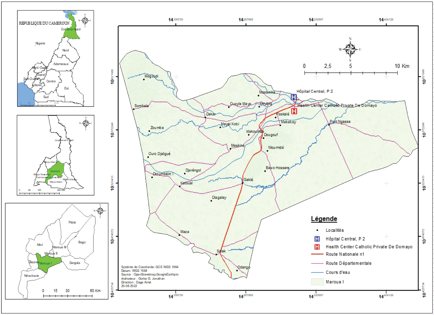 A cross-sectional descriptive study was carried out in the Regional Hospital of Maroua and a private Catholic Health Centre in the Far North region of Cameroon. The location of the different health structures in the study site is presented in Figure 1.