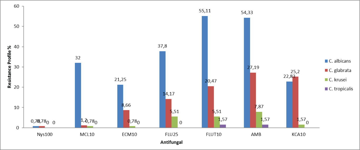 The isolated Candida species were tested for resistance to different antifungal drugs and their resistance profile of these Candida species is presented in Figure 3. Contrary to what we could have expected, C. albicans species showed a low resistance rate to Nystatine 100 (0.78%) and higher resistance rate to FLU10 (55.11%), AMB20 (54.33%). Candida glabrata showed variable resistance effects to AMB (25.2%) and KCA10 (24.4%).