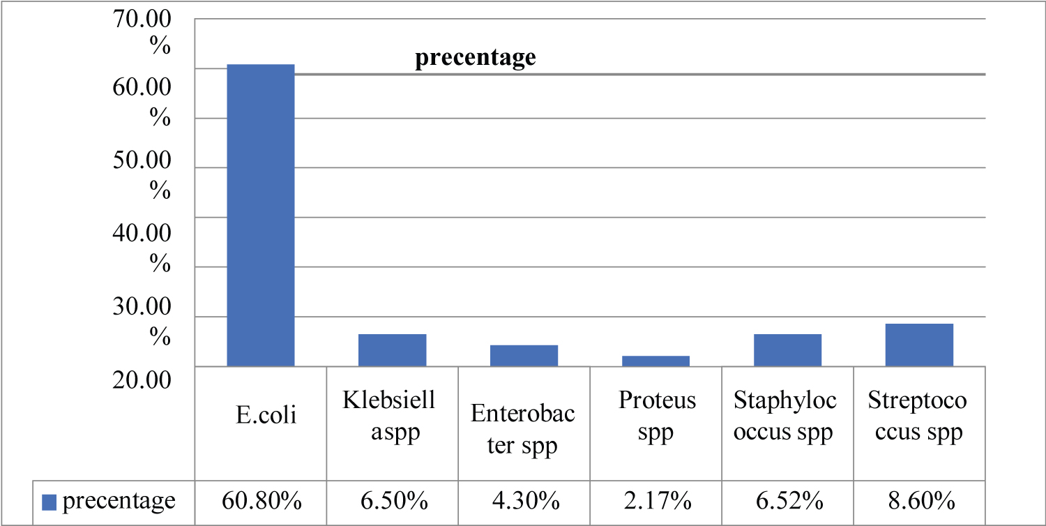 Prevalence rate of UTI among the studied subjects was 37.3%. Eschirishia coli was the most frequently isolated organism (60.8%). 39.13% isolated organism ( Staphylococcus spp , Streptococcus spp , Enterobacter spp , Klebsiella spp, Proteus spp ). Most of the isolates were resistant to at least five antibiotics, and multiple drug resistance was observed in E. coli isolates. A high degree of resistance was seen against ciprofloxacin, amoxicillin and cefuroxime (Table 2).