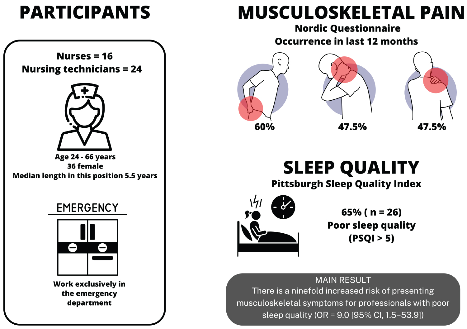 The connection between sleep disorders and chronic musculoskeletal pain is bidirectional, as inadequate sleep can amplify muscle tension, whereas chronic pain can reduce sleep quality. Both disorders are highly prevalent in nurses. This article aims to evaluate the correlation between sleep quality and musculoskeletal symptoms in the nursing team of a university hospital. We designed a cross-sectional study that included 40 nursing practitioners who work exclusively in the emergency department. The Nordic Musculoskeletal Questionnaire was used to verify the prevalence of musculoskeletal symptoms and the sleep quality was assessed by the Pittsburgh Sleep Quality Index. Most of the professionals were overweight and had at least one chronic comorbidity. The highest prevalence of symptoms was at the lower back. There is a nine fold increased risk of presenting musculoskeletal symptoms for professionals with poor sleep quality (OR = 9.0 [95% CI, 1.5-53.9]) (Graphical Abstract).