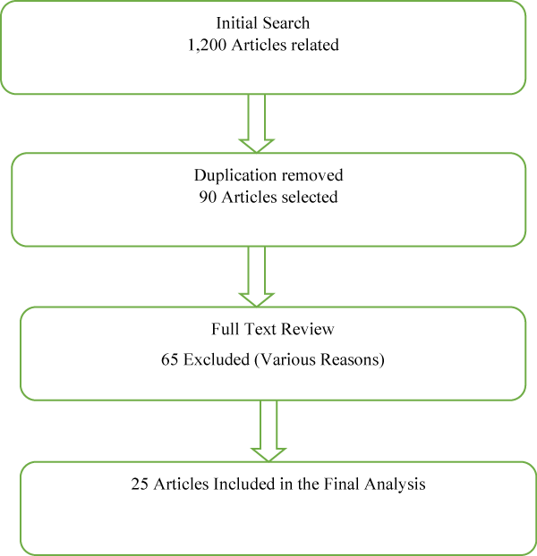The initial search resulted in 1,200 articles. After removing duplicates and screening for relevance, 90 articles were chosen for full-text review. Out of these, 25 studies met the inclusion criteria and were included in the final analysis. The PRISMA flow diagram outlining the study selection process is shown in the following figure (Figure 1).