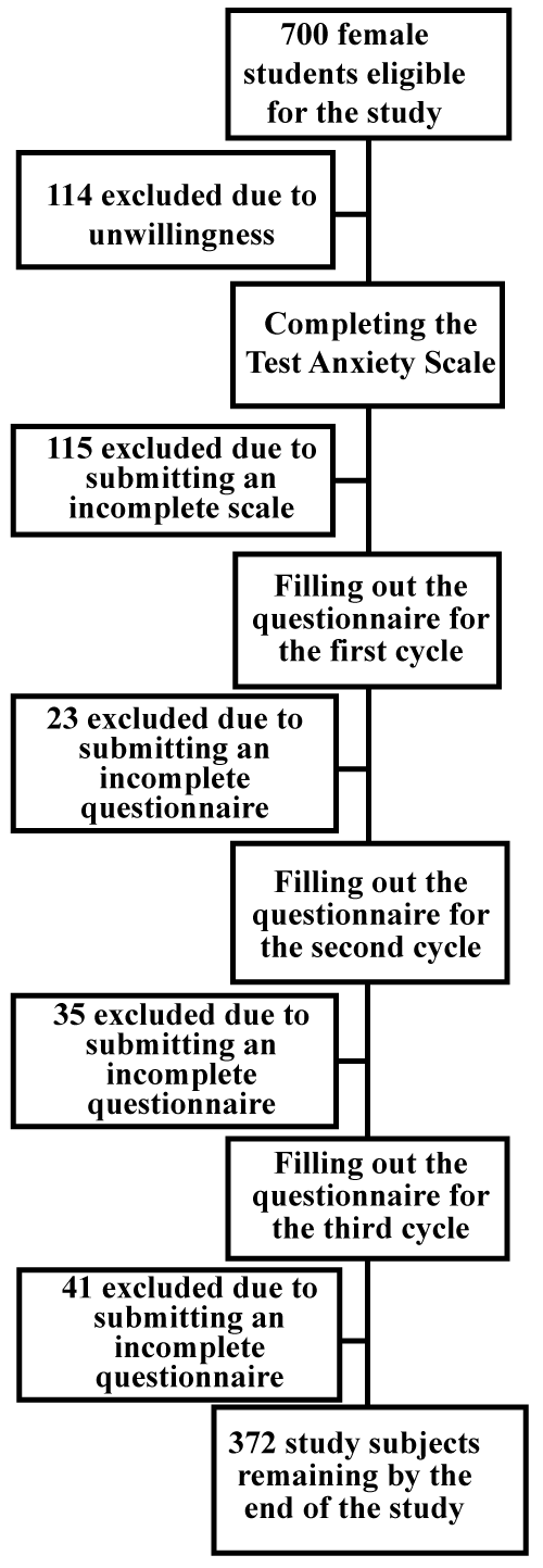The study subjects included 700 female students at Arak University of Medical Sciences, 114 of whom were unwilling to participate in the study, 115 submitted an incomplete Test Anxiety Scale and 99 withdrew from the study (making for a total of 328 exclusions). The data obtained from the remaining 372 participants were analyzed (Figure 1).