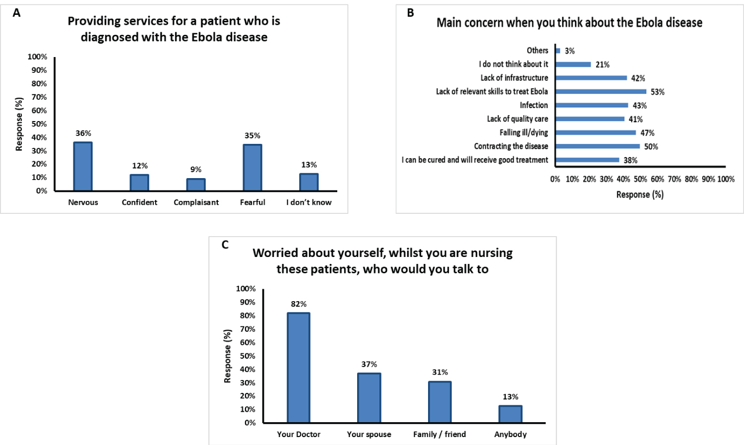 Figure 2 showed the response of the participant on their attitude towards Ebola patients and themselves after nursing Ebola patients. Figure 2A showed that feelings of nervousness (36%) and fear (35%) were reported by respondents when providing services for a patient who was diagnosed with the Ebola disease. The response of the participants showed in Figure 2B that the lack of relevant skills to treat Ebola in South Africa was their main concern (35%). This response (lack of skills to treat the Ebola patients) was followed by their concern about contracting the disease (50%). The majority of the participants said they will talk to their doctor if they have worries after treating Ebola patients (Figure 2C).