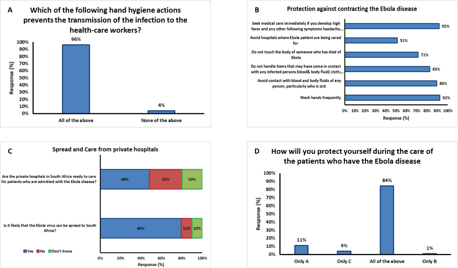 Figure 3C shows the preparedness of private hospital towards Ebola disease and likelihood of the diseases spreading in South Africa. 80% of the respondents feel that it is likely that the Ebola virus could spread to South Africa compared to 11% who do not think so. Only 48% of respondents feel that private hospitals in South Africa are ready to care for patients who are admitted with the Ebola disease, compared to 32% who do not think so. The response of the participants towards protecting themselves against Ebola infections is shown in Figure 3D. The results show that 84% of the respondents indicated that 'A. Anyone entering the patient's room should wear gloves, a gown, eye protection (goggles, face shield) and face mask'; 'B. Additional personal protective equipment (PPE)'; and 'C. Should frequently perform hand hygiene before and after patient contact, contact with potential infectious material, and before putting on and after removing PPE, including gloves'.