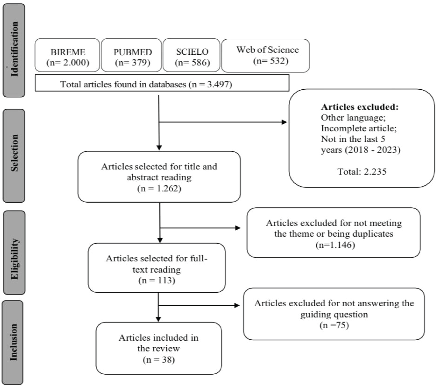 The inclusion criteria adopted were full-text original articles published from 2018 to August 2023 in Portuguese and English languages. The exclusion criteria were duplicated articles across multiple databases and review articles.