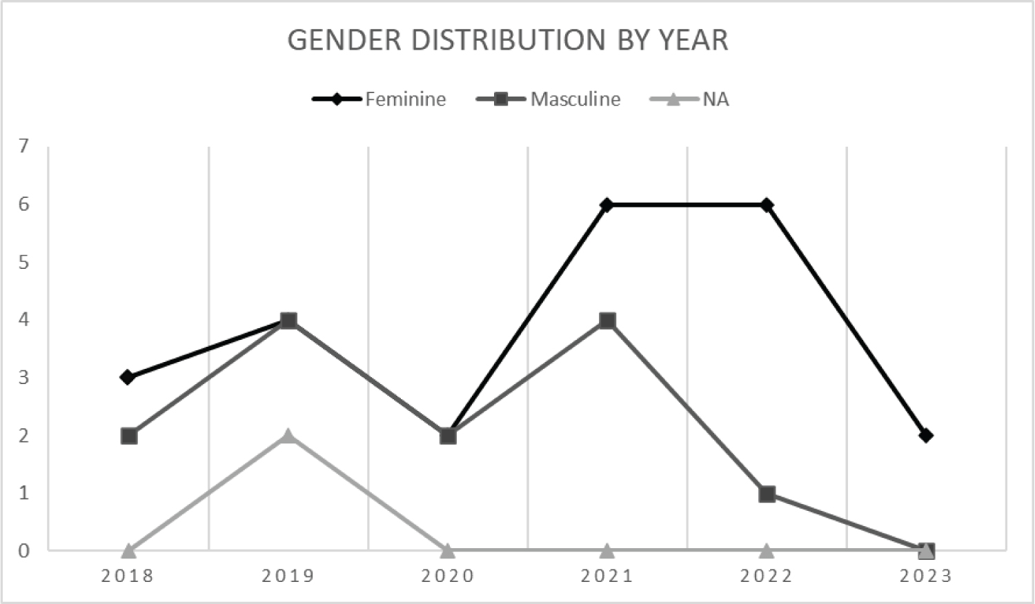 In Figure 3, we can observe the quantification of female, male, and Not Applicable (NA) participation in publications from 2018 to August 2023. The greater participation of females compared to males in the reference services of the Unified Health System (SUS) in the researched articles is noticeable. However, this representation was not always the case, but with the continuous efforts of feminist movements, the Comprehensive Women's Health Care Policy (PAISM) was created in 1983, establishing the perspective of gender equality in the country's healthcare, becoming a fundamental reference for women's health advocacy to this day [42].