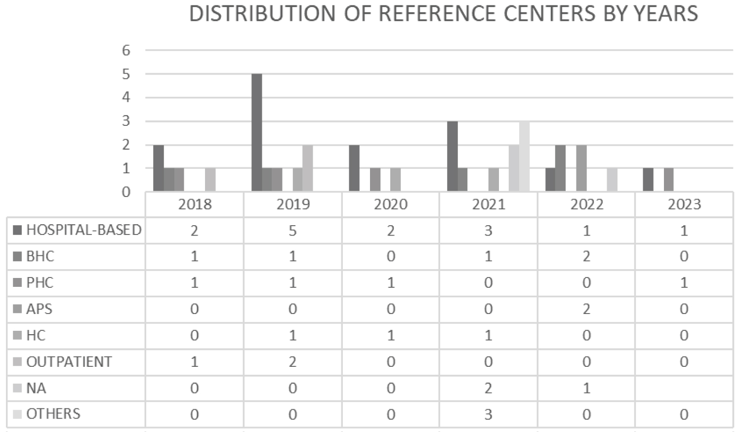 The prevalence of hospital-based care over other reference centers during the analyzed period may also be influenced by the COVID-19 pandemic. Many outpatient appointments, home care services, and other strategies were suspended or reorganized for a certain period to control the virus spread. Therefore, during this period, hospital-based studies tended to be more prominent and abundant since hospitals were among the few healthcare facilities that remained operational during the pandemic [44].