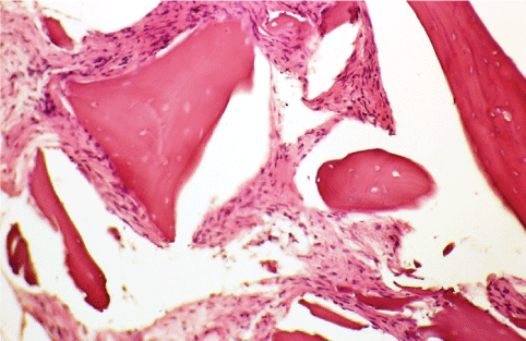 Figure 3: Histological micrographs of vertical sections of extraction socket, and treated with collagen membrane and porcine derived-bone (Ematossin eosin, 50X). View Figure 3