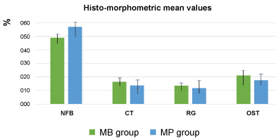 No differences in dimensional vertical and horizontal changes were encountered at the extraction sockets treated with MB and MP. Histomorphometrically, in sites treated with MB the percentage of newly formed bone was 49.08 ± 3.7, and the percentage of connective tissue was 16.37 ± 4.9, while in sites treated with MP, newly formed bone represented 57.13 ± 2.8, and non-mineralized connective tissue 13.65 ± 3.6. In the MB group, the mean percentage of residual graft particles and osteoid tissue was 13.49 ± 2.8, and 21.06 ± 3.8, respectively, while in the MP group, the same percentages were 11.74 ± 4.7, and 17.63 ± 3.8. Histomorphometrically, differences between MB and MP groups were statistically significant (p < 0.05).