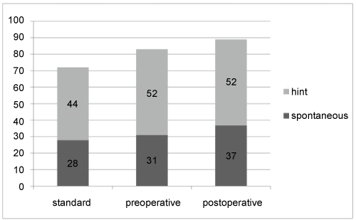 The results of the hint reproductions were 4.4 ± 1.4 items for the standard group, 5.2 ± 1.5 items for the preoperative and 5.2 ± 2.1 items for the postoperative group (not significant). For the total score (spontaneous + hint score) however, there was a significant difference between the standard group and the pre- and postoperative group, as the standard group remembered 7.2 items as compared to the 8.3 items for the preoperative and 8.9 items for the postoperative group (p < 0.001) (Kruskal-Wallis). There was a moderate positive correlation (+0.30 to +0.39) between the level of education and the memory score.