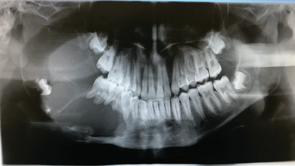 Figure 4: Post-operative (12 months) OPG depicting a now mature ossicle ready to receive dental implants and rehabilitation of the dentition.