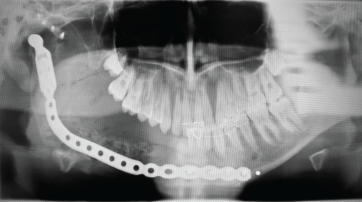 Figure 3: Post-operative (4 weeks) OPG showing a reconstruction plate with early and immature bone graft.