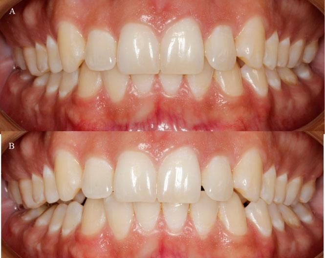 Figure 2: A) Intraoral photography showing maximum intercuspation; B) Intraoral photography showing maximum mouth opening.