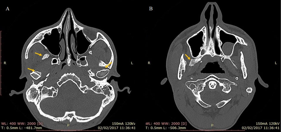 Several imaging tests are described as complementary diagnostic tests for MOT, such as X-ray, CT and Magnetic Resonance Imaging (MRI). For adequate surgical planning, Torres, et al. [6] have suggested that CT associated with the use of biomodels improves the visualization of the shape and location of lesions and can simulate the best localization of incisions and osteotomies, minimizing surgical risks. Conner and Duffy (2009) [7] indicate periodic CT scans every 2-3 months to evaluate the progression and confirm the interruption of the ossification process.