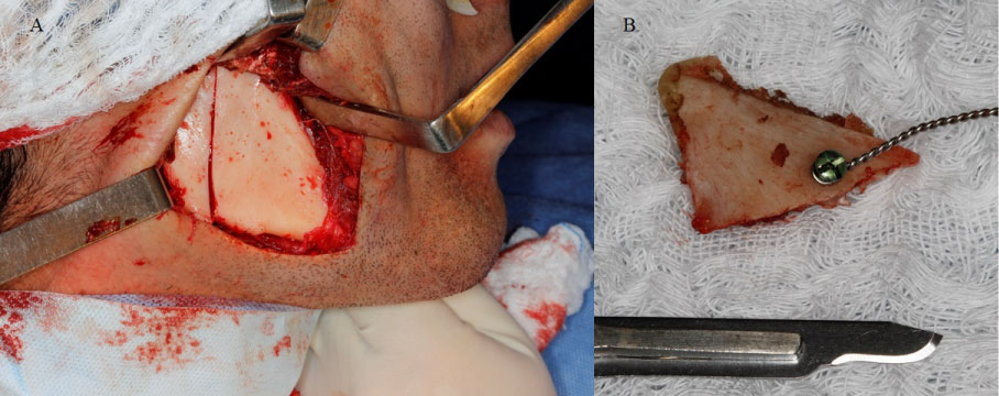 Figure 5: A) Transoperative photograph of vertical osteotomy of the mandibular ramus and coronoidectomy for access to the right medial pterygoid muscle; B) Fragment of coronoid bone removed during surgery.