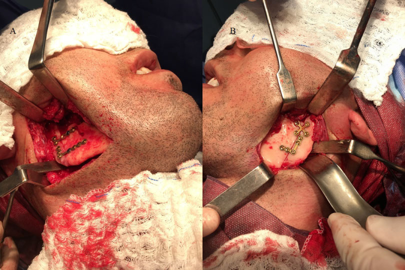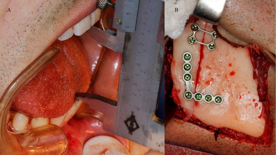 Figure 6: A) Transoperative photograph of maximum buccal opening obtained after the first surgical procedure; B) Fixation of the vertical osteotomy of the mandibular ramus.