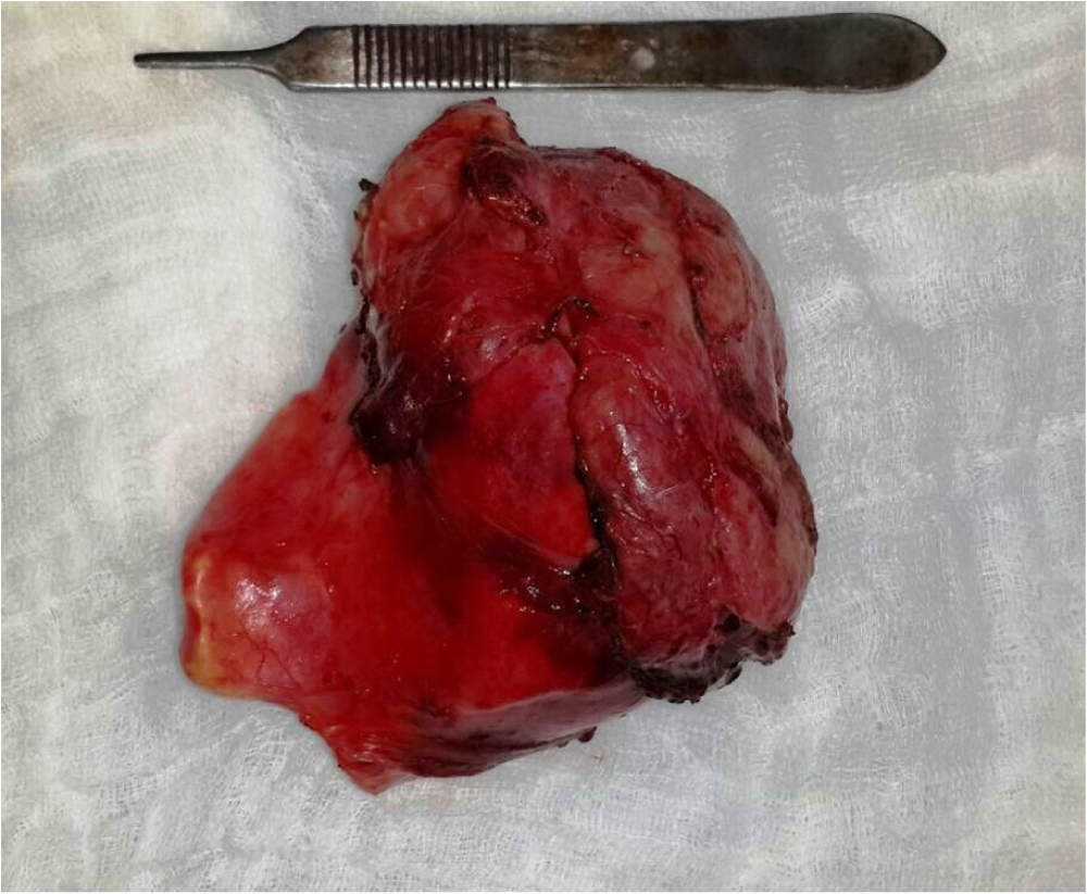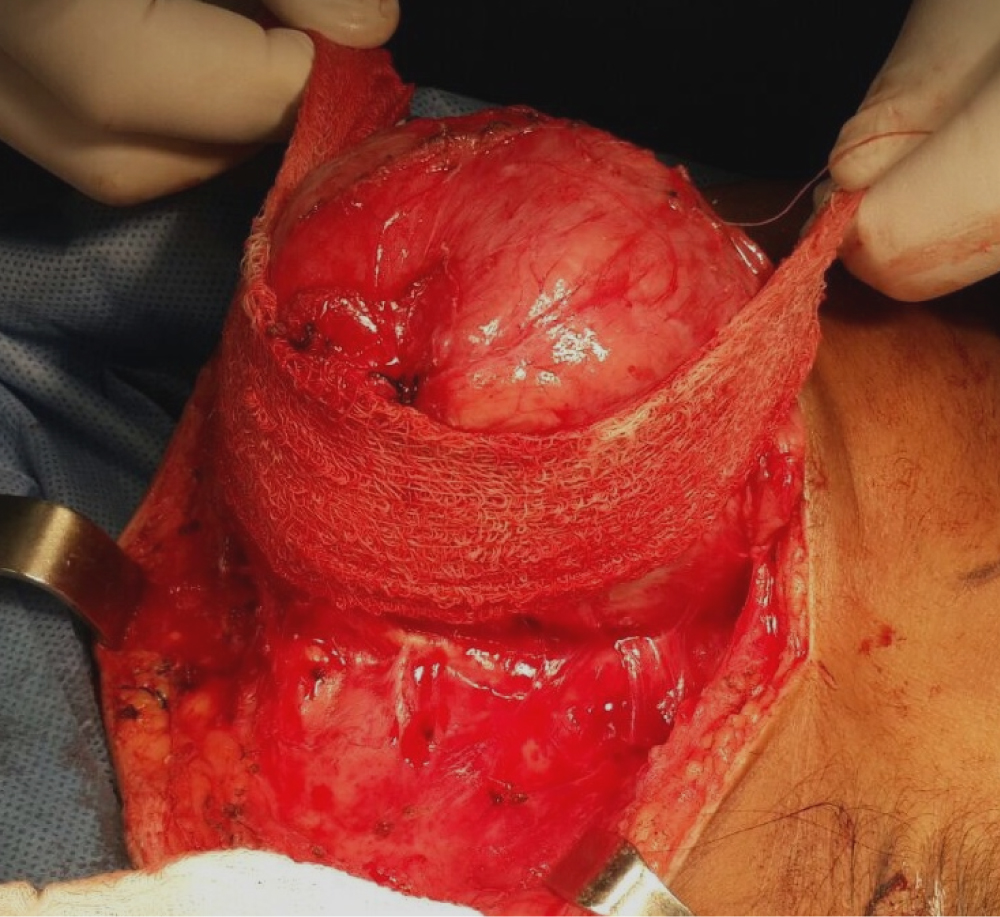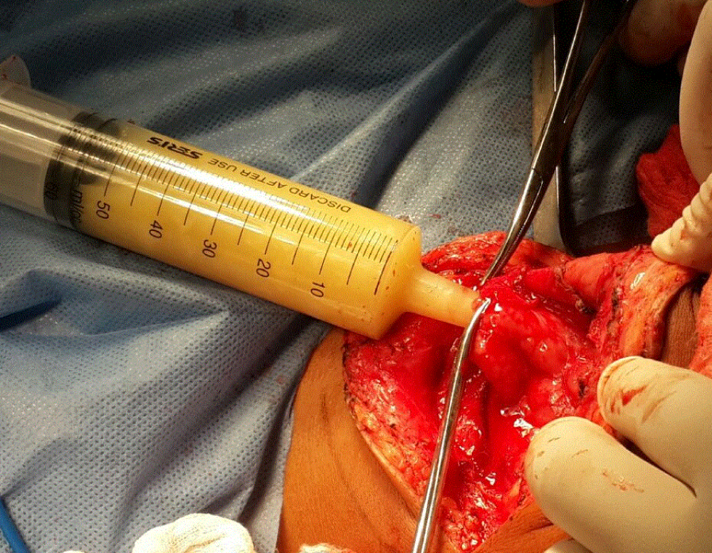 All patients were treated in the operating room under balanced general anesthesia. After an adequate infiltration of lidocaine with 1:100.000 epinephrine, the incision of the superficial plane was made, minimizing bleeding and performing hydro dissection in the superficial planes of the surgical bed, the dissection was continued until the cystic lesion was meticulously exposed. Subsequently, a fine needle aspiration of the cystic content was performed and, with the needle in place, a syringe containing a mixture of low-density alginate was inserted and injected into the lumen of the lesion in proportion 1:1 to the aspirated liquid, replacing the liquid content with the irreversible hydrocolloid (Figure 1 and Figure 2) Once the material is gelled, it occludes the light of the cyst closing the minimum incision with it. The enucleation of the lesion was performed resecting it in its entirety and in a single piece by blunt dissection, without damaging adjacent structures, performing hemostasis and primary closure by planes (Figure 3). The specimen obtained in one single piece and aspirated liquids were sent to histopathological and cytopathological study respectively (Figure 4).