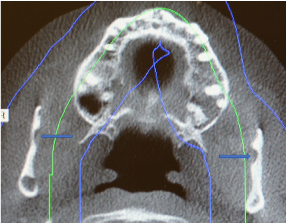 Figure 3: Axial cone beam CT scan showing SBC (Blue arrows) with herniation of soft tissue of the bilateral ramus of the mandible.