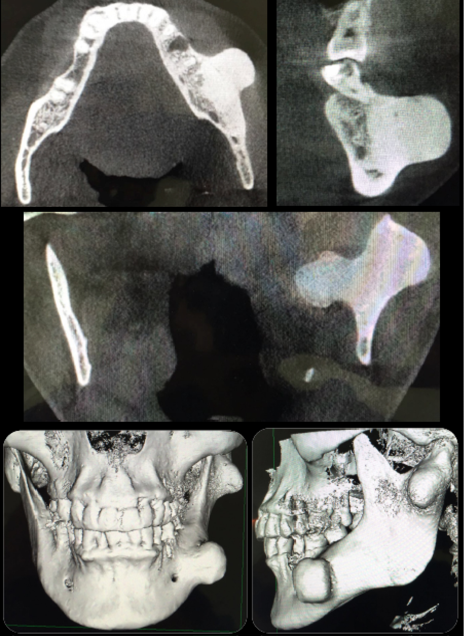 Figure 2: Pre-operative study. Axial and coronal sections of computed tomography show the different osteomas, both at the body level and the left mandibular condyle. Frontal and lateral views of three-dimensional reconstruction, showing the size and exact location of the mandibular osteomas.