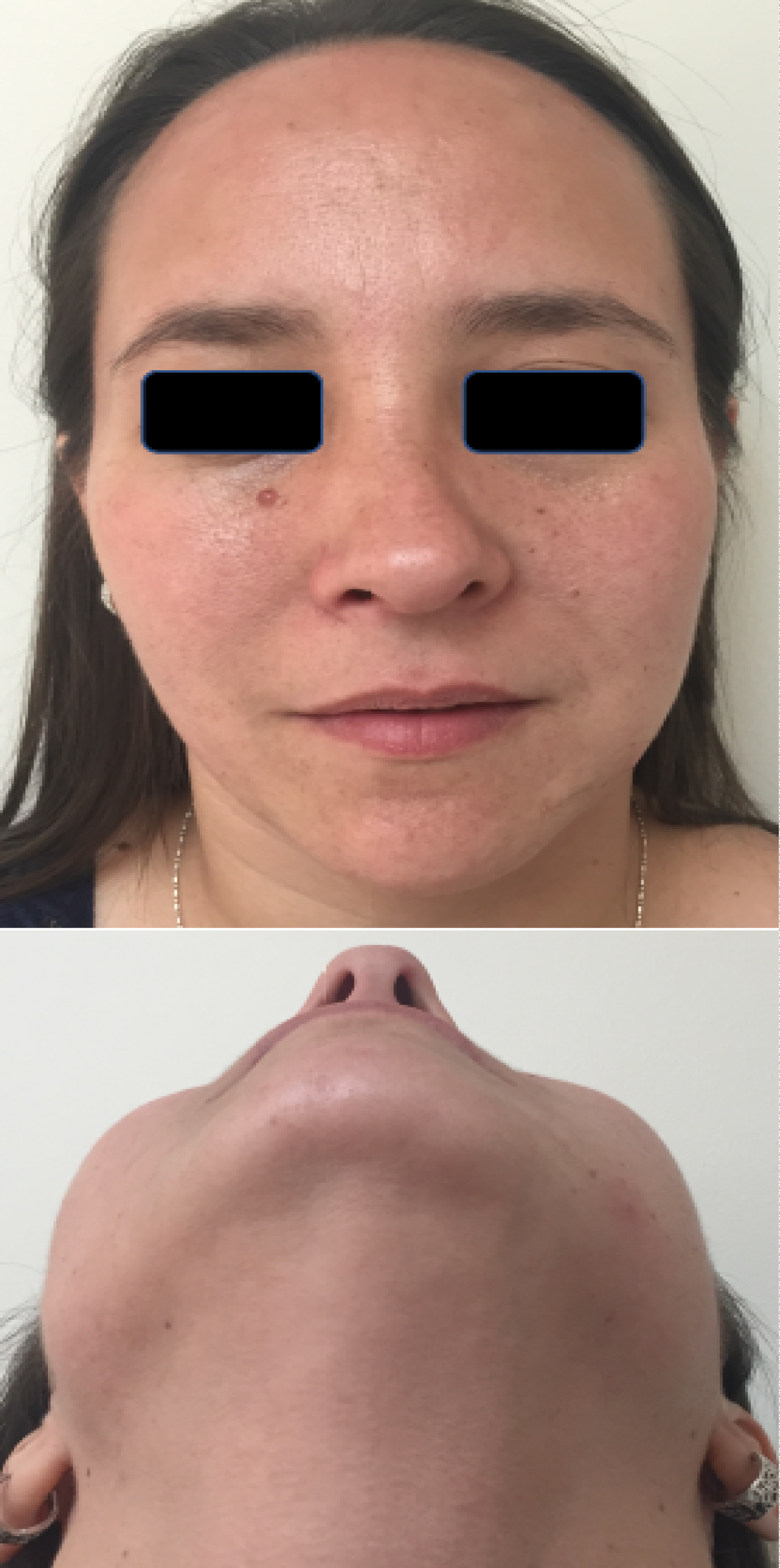 36-year-old female patient, without relevant medical history, was referred to the Maxillofacial Surgery Unit of the Hospital del Salvador (Santiago, Chile), for progressive increases in volume (six years of evolution) at the level of the mandibular body and left preauricular area, painless, well defined and of hard consistency (Figure 1). The patient complains of paresthesia at the level of the left labial commissure, and sounds in the left temporomandibular joint when she eats. The mouth opening is normal, without deviations, and no significant occlusal discrepancies were detected. The skin and oral mucosa of the affected areas appear healthy. A history of local trauma, infection, or some other causal factor was ruled out. A craniofacial computed tomography scan is requested, which shows the presence of three hyperdense areas with net edges and pedicled base, each one with an average size of 20 mm in diameter, compatible with peripheral mandibular osteomas. One is located at the level of the left mandibular body, very close to the exit of the mental nerve, another is located on the lateral aspect of the left mandibular condyle and finally the other is located on the internal aspect of the left mandibular condyle. Cortical perforation and periosteal reaction are not observed (Figure 2).
