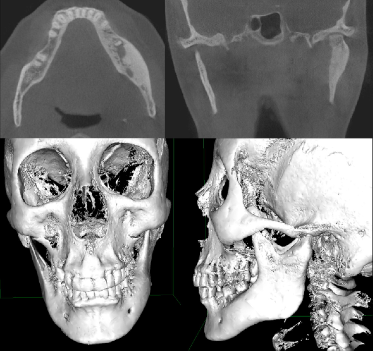 Figure 6: Post-operative study. Axila and coronal sections of the CT, and three-dimensional computed tomography reconstruction (12 months post-operative). Front and lateral view, where a complete restoration of the normal mandibular anatomy is observed, without radiographic signs of recurrence.
