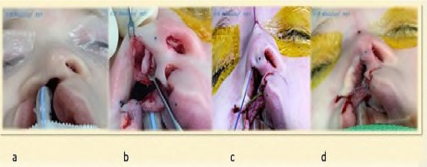 Figure 3: Case 2: (a) intraoperative basal view; (b) Lateral crus dissection, skeletonizing and steal maneuver for medial crus lengthening; (c) The 3 key sutures: A Cinch ethibond suture holding alar fibrofatty tissue to premaxillary periosteum; Trans-domal PDS suture; and the Cantilever lifting vicryl thread, seen coming out at the radix; (d) All 3 sutures have been tied beginning with the Cinch, followed by Trans-domal, and last the Cantilever thread. The nose has been fully reconstructed prior to and independent to the lip repair.