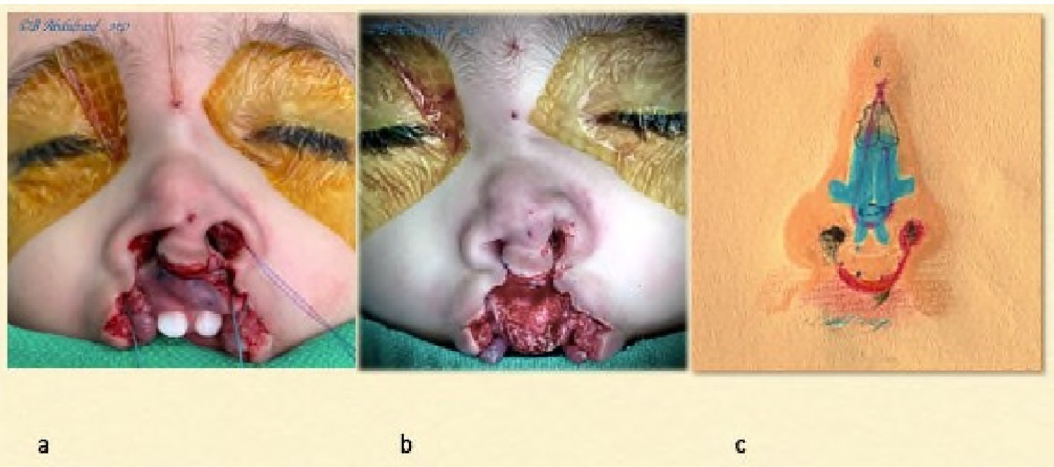 Figure 4: Case 1: (a) Intraoperative, all 3 main sutures been placed as per the steps shown in the previous illustration. The sutures have been tied beginning with the cinch, followed by trans-domal and last the loop suture was tied; (b) The Bilateral cleft lip is still not repaired yet, but the nose has been fully addressed with the semi-closed technique; (c) Author's depiction of the underlying nasal repair and role of various sutures.