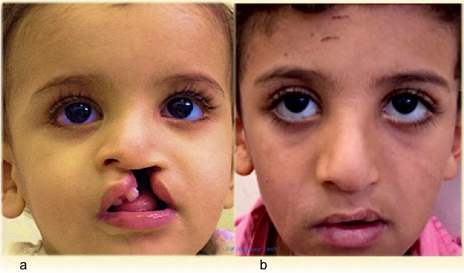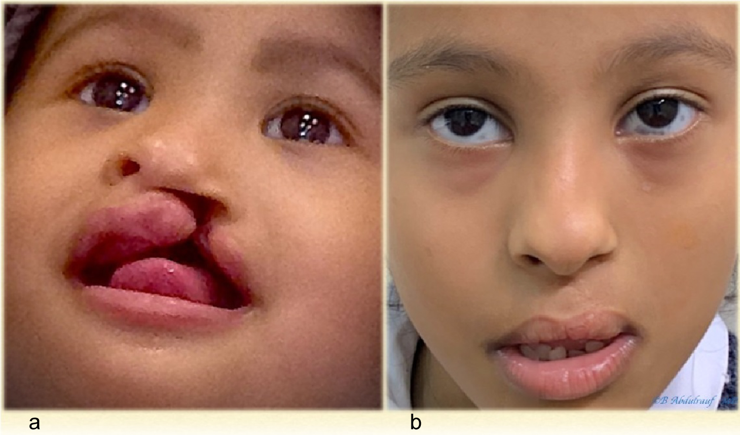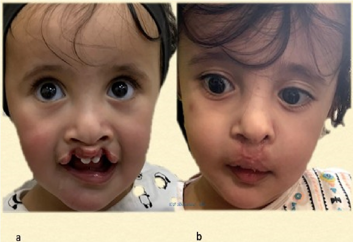 Figure 9: (a) Case 1 was used for technique demonstration as an example of BCLND, operated at age of 14 months; (b) 3 months follow up, we intentionally preserve the philtral width at primary surgery instead of banking or discarding, this would be extremely useful in case of a future Rhinoplasty otherwise the lip can be revised to optimal philtral width at teenage.