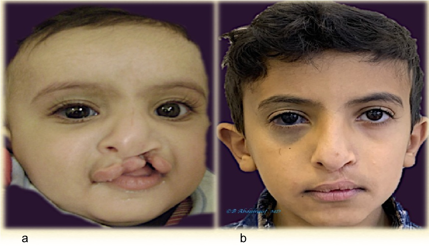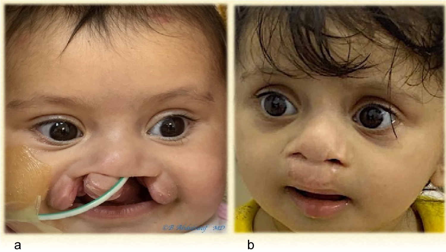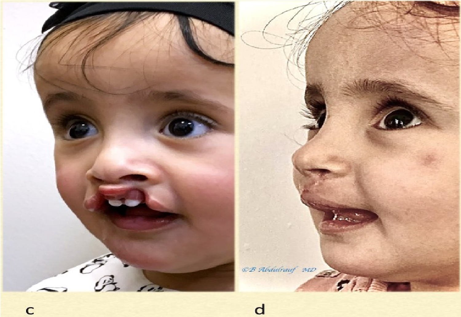 Figure 9: (a) Case 1 was used for technique demonstration as an example of BCLND, operated at age of 14 months; (b) 3 months follow up, we intentionally preserve the philtral width at primary surgery instead of banking or discarding, this would be extremely useful in case of a future Rhinoplasty otherwise the lip can be revised to optimal philtral width at teenage.