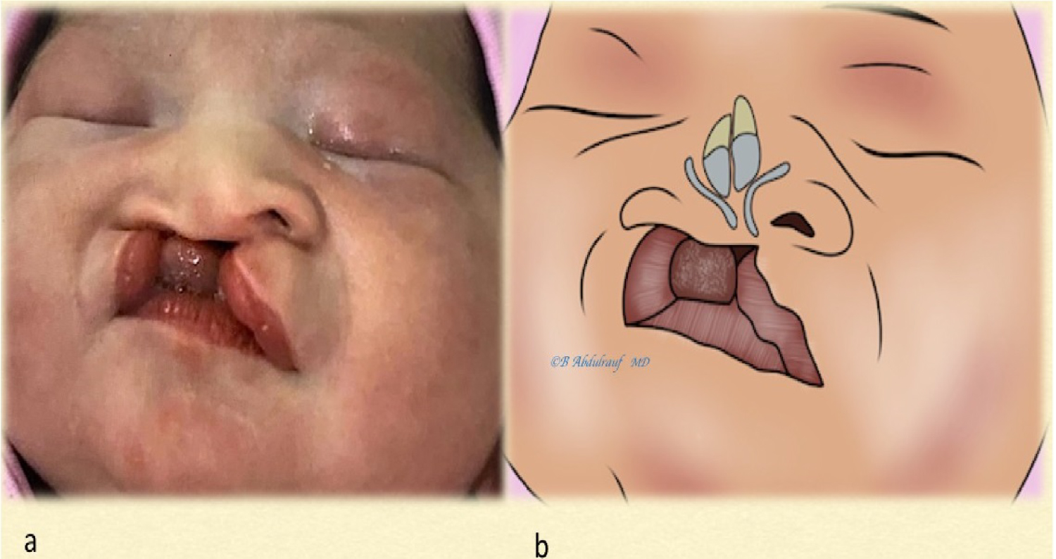 Figure 11: Case 2: (a) As a newborn with a severe UCLND, significant alveolar gap, the caudal septal and columellar deformity is quite pronounced; (b) Expected underlying cartilaginous deformity on cleft side and significant asymmetry based on the "tilted Tripod" theory.