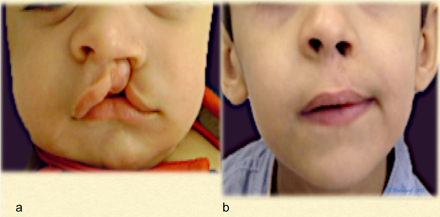 Figure 13: Case 3: (a) BCLND, severe and significant asymmetry, operated at 6 months; (b) One year postoperative follow up is shown. Although we use some maneuvers of Mulliken's methods but we save most of the philtra skin at this age.
