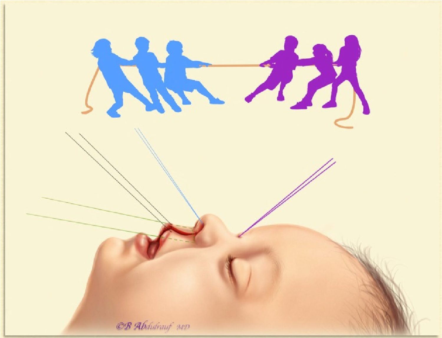 Figure 20: The Nasal and Lip units share borders, when there is cleft it tends to act as a malformation. Simultaneous repair to both whether in childhood or secondarily means attempting to recruit tissues in opposite vectors. Tissues will resist due to their inherent memory and compromise of results on either side is probable. Hence the analogy "Tug of War" phenomenon.