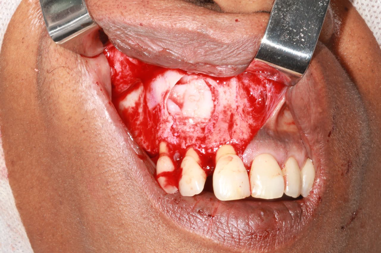Figure 2: After the cyst enucleation filling the defect with L-PRF and Bioss.