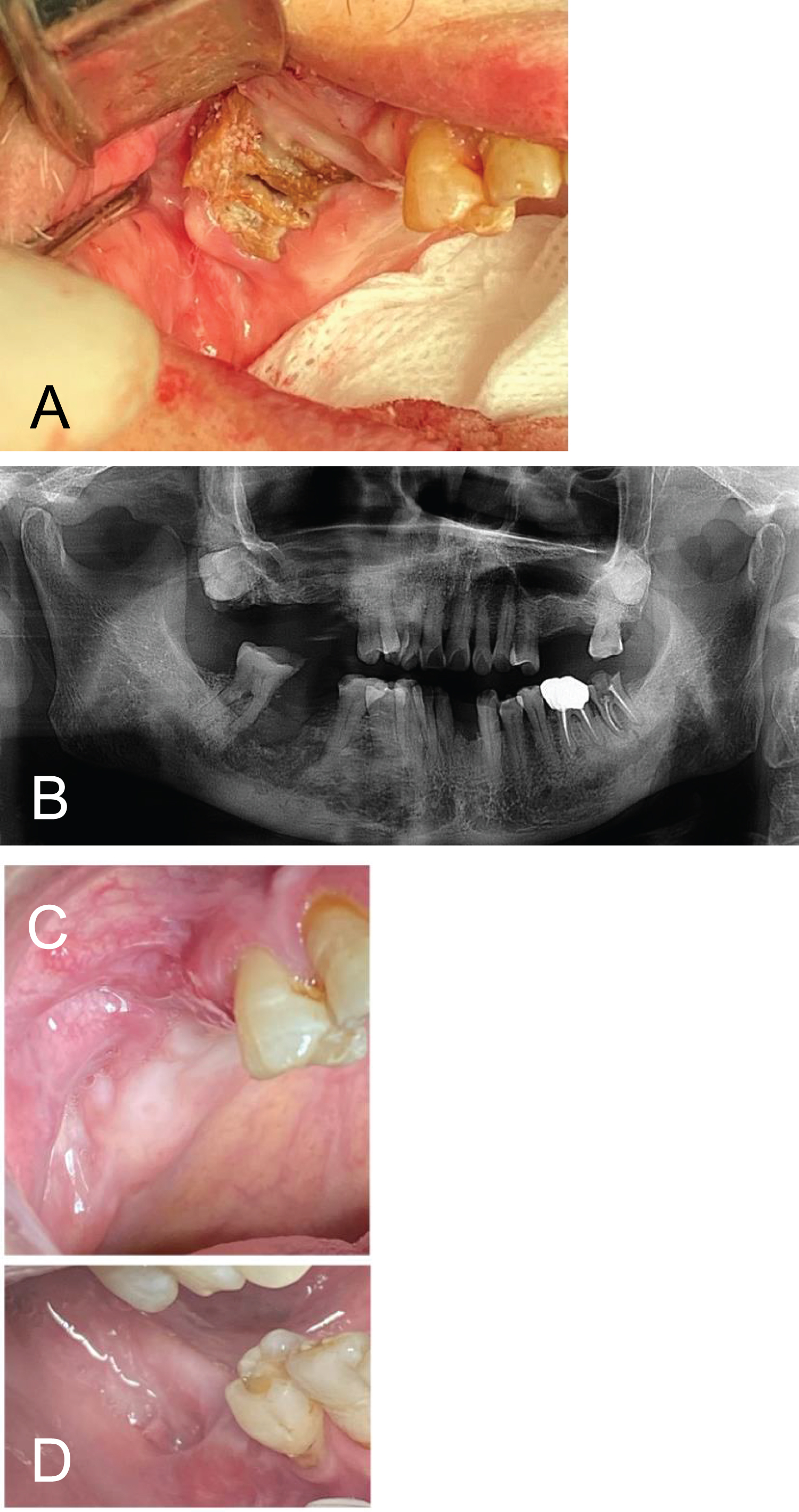 This was an 83-year-old male who had stage IV multiple myeloma. He had been treated with chemotherapy and 10 infusions of zoledronate (Zometa) three years prior to referral. He was referred by his general dentist for infection of the right mandible. Examination showed necrotic bone in the right maxilla and an intraoral fistula with purulent discharge in the right mandible (Figure 1a). He also had purulent discharge from the gingival sulcus around every tooth. Panoramic radiograph showed a radiolucency in the right maxilla and mandible (Figure 1b). The patient had been treated conservatively for three years with chlorhexidine mouthwash and oral amoxicillin. During this time the infection was under control. However, the necrotic bone in the right maxilla remained unhealed and the right mandibular lesion continued to discharge. He then developed Clostridium Difficile colitis and the amoxicillin was discontinued following which the infection quickly recurred. At this time, his cancer also relapsed, and his general health deteriorated. His chemotherapy was repeated and when his health was improved, surgical debridement and long-term IV antibiotics were proposed. Due to a low hemoglobin (9 mg/dL) and low platelet count (60k), the patient received two units of packed red blood cell, as an outpatient, prior to debridement. A peripherally inserted central catheter (PICC) line was placed prior to the surgery and monitored anesthesia care was managed by a separate anesthesiologist in the private practitioner's freestanding office. Microbiology specimens were collected and sent to Quest Diagnostics Laboratories. Two teeth were removed and sequestrectomy was performed on the mandible. Following this, sequestrectomy was performed on the right maxilla where an oroantral defect was closed with a buccal fat pad and a buccal mucosa flap. Specimens were sent for pathological examination. Intravenous ertapenem was commenced immediately after the surgery as an empiric antibiotic following outpatient consultation with an infectious disease specialist. He was maintained with nil by mouth for two weeks postoperatively and was given total parenteral nutrition at home following consultation with appropriate specialists. Microbiology reported normal oral flora sensitive to most antibiotics. Ceftriaxone was added to the ertapenem one week postoperatively. After a six-week intravenous antibiotic course, he was given three further weeks on oral penicillin VK. The patient is currently doing well with no exposed bone, and infection free for almost one year following completion of treatment (Figure 1c and Figure 1d).