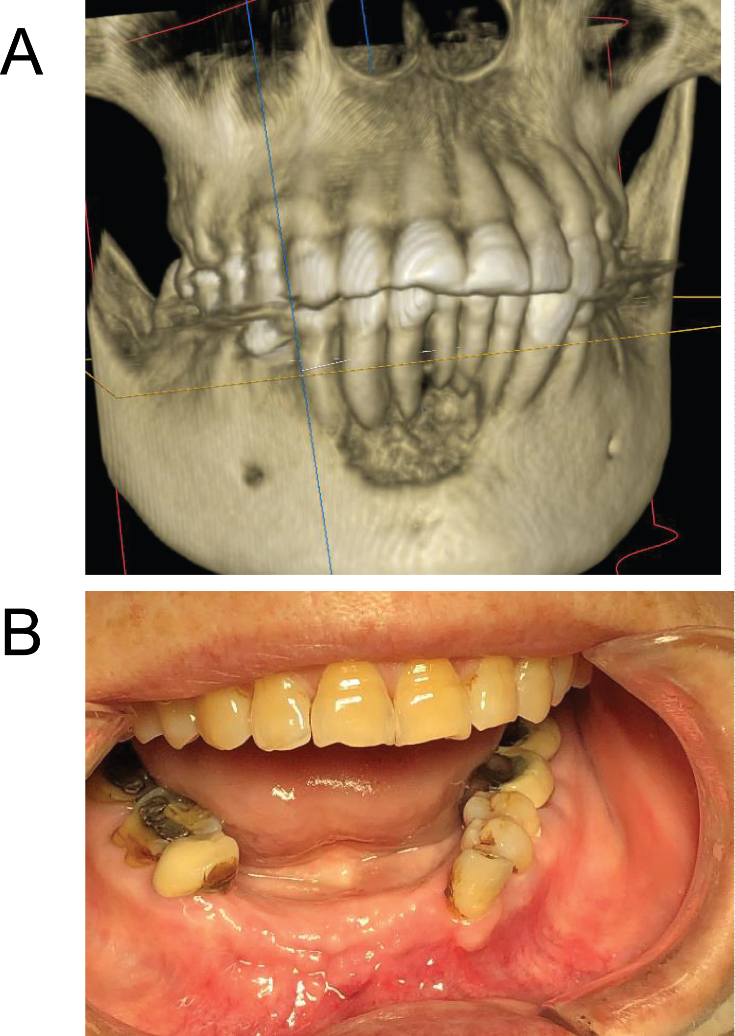 A 72-year-old Filipina female with a history of osteoporosis was treated with oral alendronate in form of Fosamax. She had been taking this regularly (35 mg once weekly) for over ten years. Exposed necrotic bone appeared in the right maxilla and left mandible with purulent discharge three weeks following tooth extraction carried out by her general dentist. The infection was treated with oral amoxicillin for two years before she was referred to an oral and maxillofacial surgeon (HL). The patient reported that every time she came off the antibiotics, the purulent discharge rapidly recurred. The patient underwent surgical debridement with primary closure in the office and six weeks of IV ertapenem. The infection resolved, the mucosa healed, and the patient has been infection and pain free for three years (Figure 3a and Figure 3b).