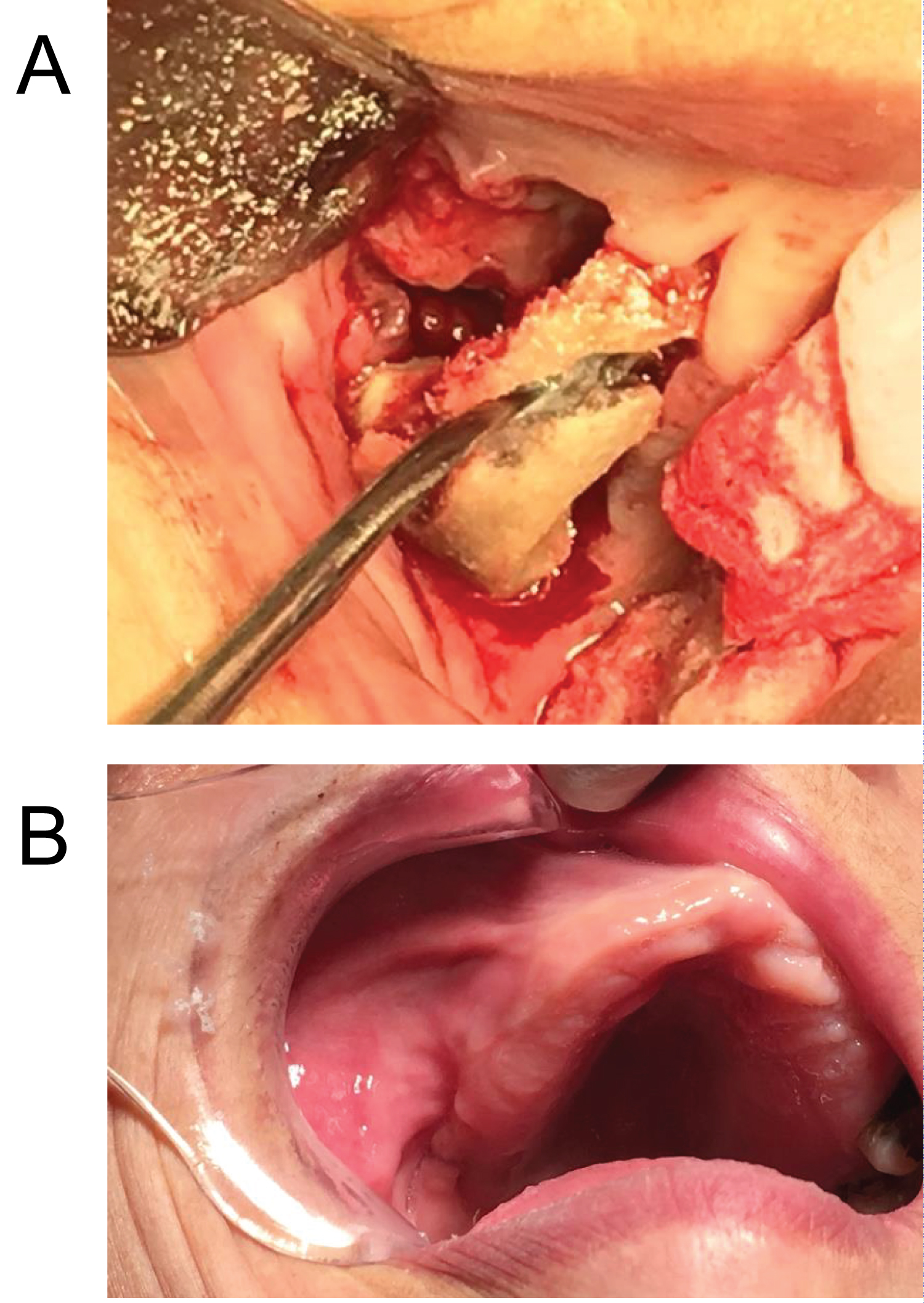 Figure 3: (a) Necrotic bone being removed en-bloc from right maxilla; (b) Right maxilla wound had healed well at four-month postop follow-up visit. View Figure 3