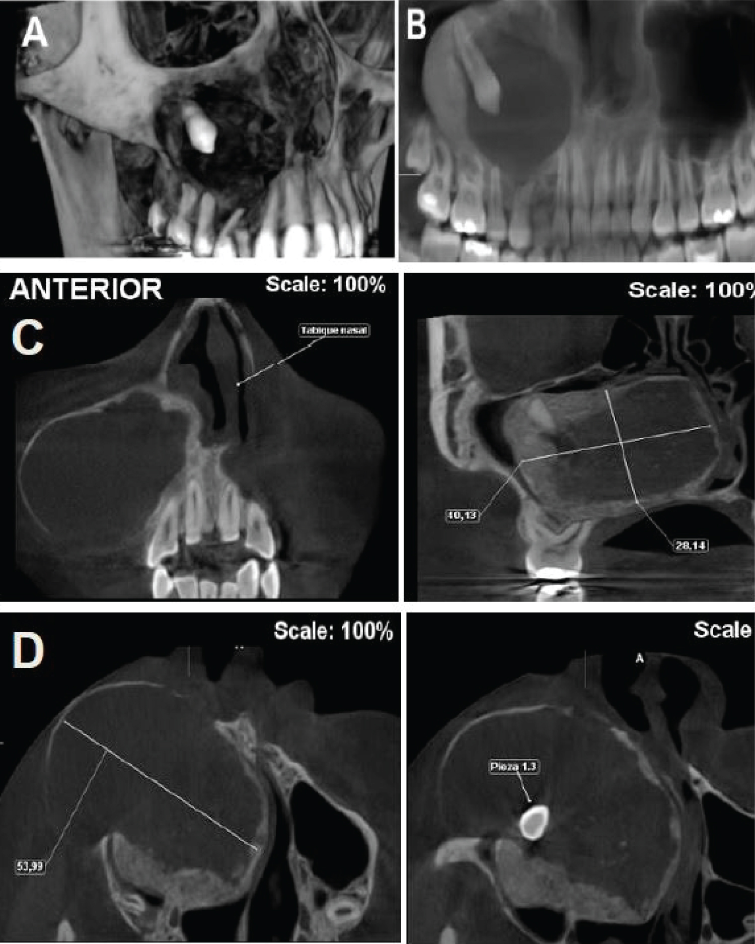 17-year-old female, with no diseases or allergies, attends evaluation with the Maxillofacial Surgery team at "Hospital del Carmen" (Santiago, Chile) for progressive right hemimaxillary volume increase. At the extraoral examination, the increase in volume was in the right genian region, causing facial asymmetry, with clear limits and hard on palpation. Intraoral examination revealed persistence of tooth 5.3 and clinical absence of tooth 1.3. Imaging tests were requested: Panoramic radiography and cone beam tomography where a tumor mass was visualized in relation to tooth 1.3 included in the posterosuperior wall of the right maxillary sinus, 5 cm in diameter, which displaces nasal and sinus mucosa (Figure 1). The condition is explained to the patient, and it is decided to excise the lesion, including an excisional biopsy in the procedure, plus the installation of a drain.