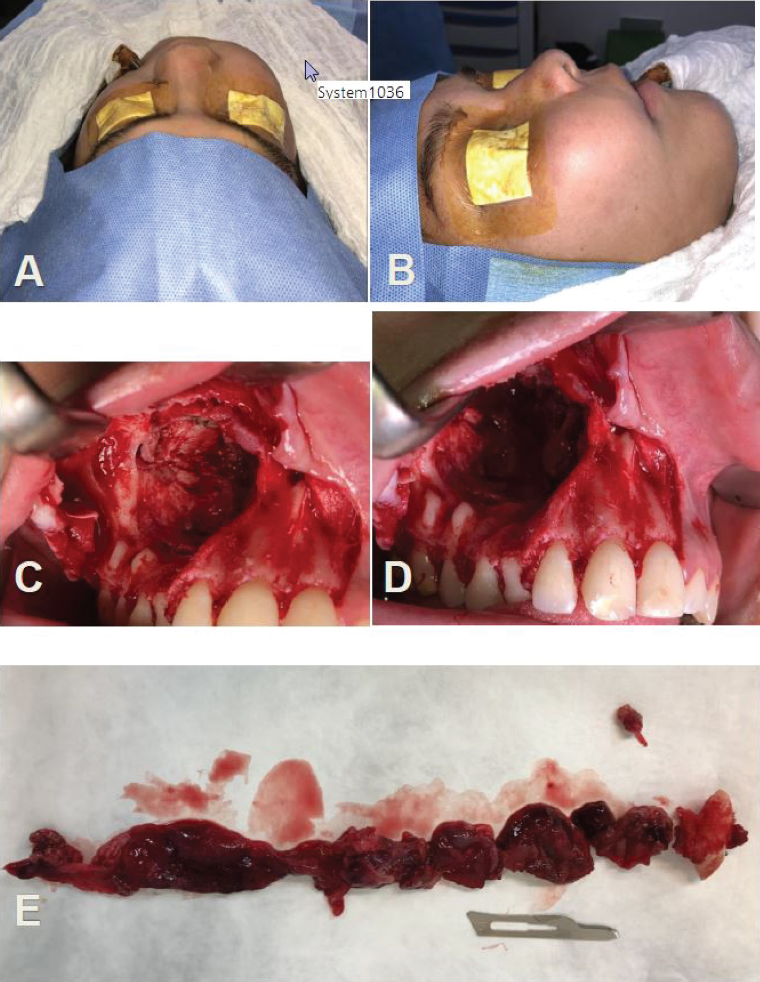 Figure 2: A) Preoperative lateral vision; B) Preoperative superior vision; C) Intraosseous injury; D) Bone cavity post enucleation injury and E) Tooth 1.3 and tumor lesion fragments.