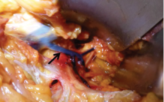 With the hip in 30-45° of flexion and the surgeon sitting on the contralateral side of the lesion, an 8-10-centimeter-long horizontal incision is made two centimeters above the pubic symphysis. The linea alba is opened in a craniocaudal direction and the rectus femoris on the same side of the fracture is subperiosteally detached, exposing the pubic symphysis and the superior pubic ramus. Subsequently, the Retzius space can be accessed after reflecting the bladder to protect it from injury. From 4 to 9 cm lateral to the pubic symphysis, 50-84% of patients present with a so-called corona mortis [13-15], a vascular anastomosis between the obturator and the external iliac artery (Figure 1). This structure must be either ligated or electrocoagulated as it is a potentially dangerous source of bleeding.