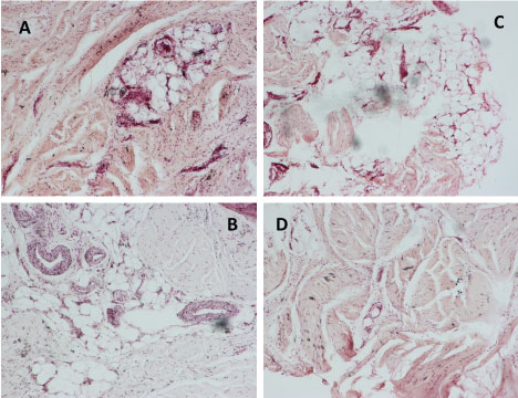 Figure 1: Haematoxylin and eosin staining of specimens [young (A) and old (B) aged women, and young (C) and old (D) aged men] of transverse carpal ligament (TCL) from showing collagen fibres, vascular proliferation, lipomatosis, and perivascular lymphocyte infiltration (H&E x 100).